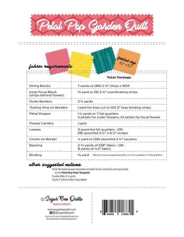 Sugar Bee Quilts offers Paper and PDF versions of their patterns. The Petal Pop collection features 7 patterns that use the Petal Pop Acrylic Template.